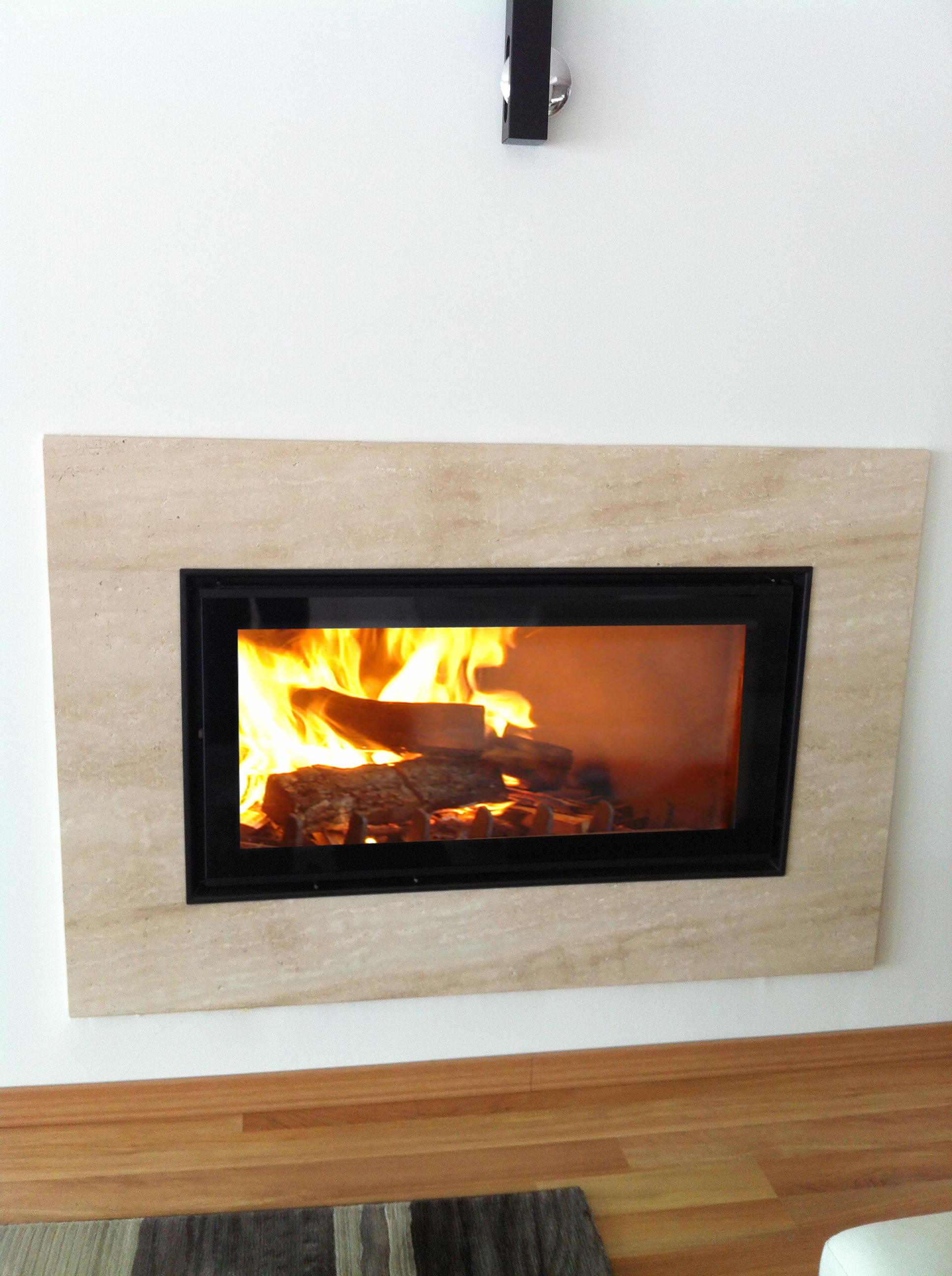 Dobozos testbe épített Edilkamin gyártmányú tűztér (SCREEN 80), mészkő kerettel, hőleadó betéttel. A nagyméretű nappali fűtésére alkalmas.