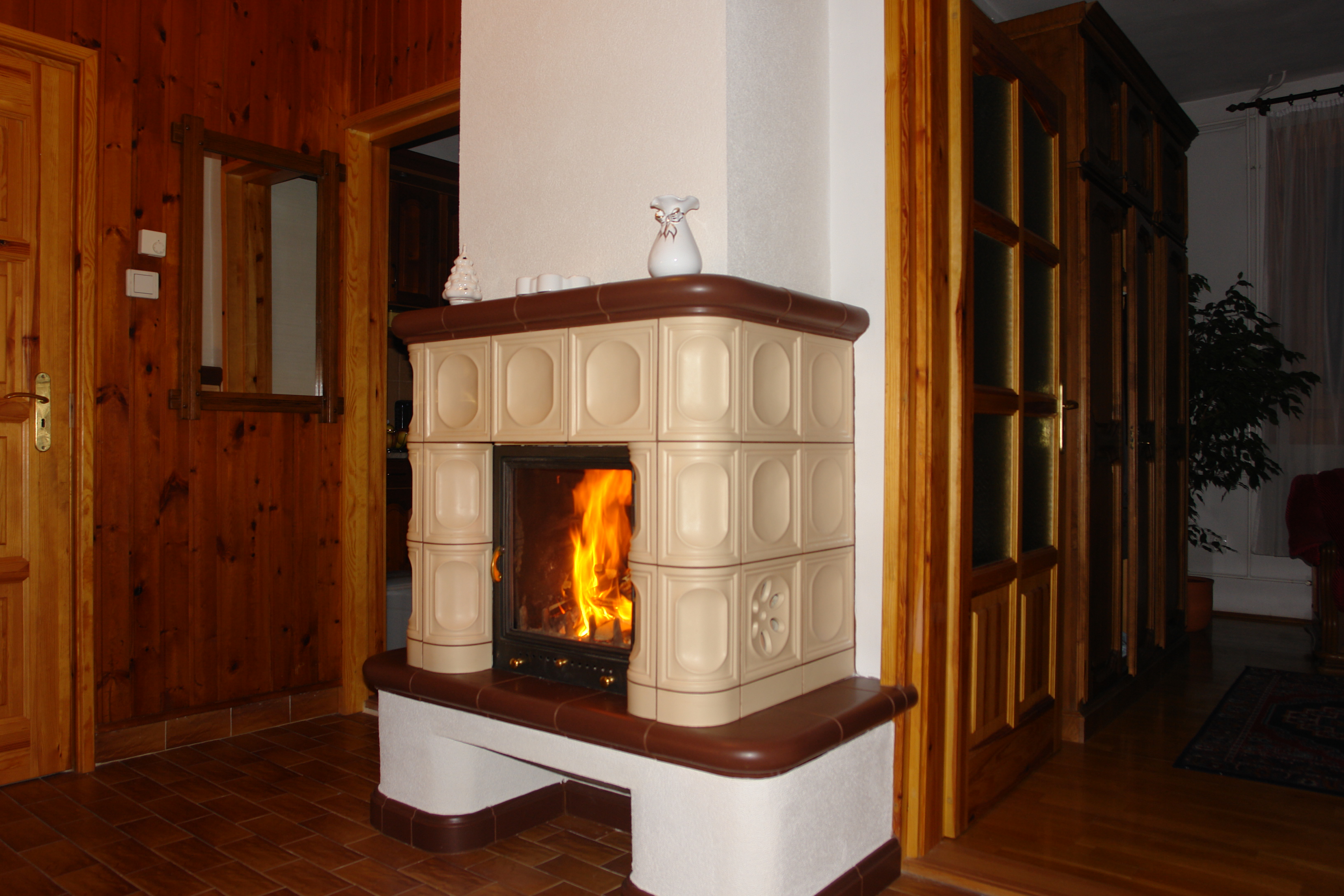 Kis méretű Benkel típusú (BODOK) tűztérrel épített csempekandalló. A nappali szobát fűti.