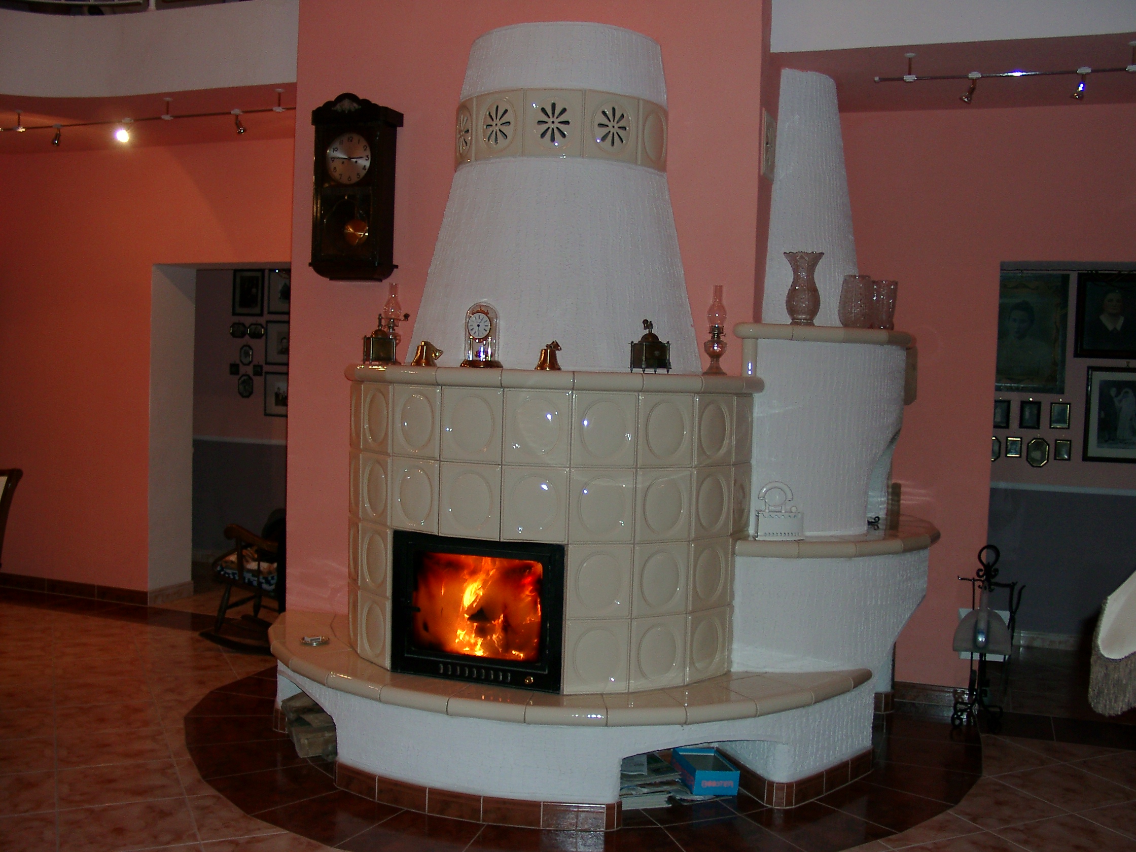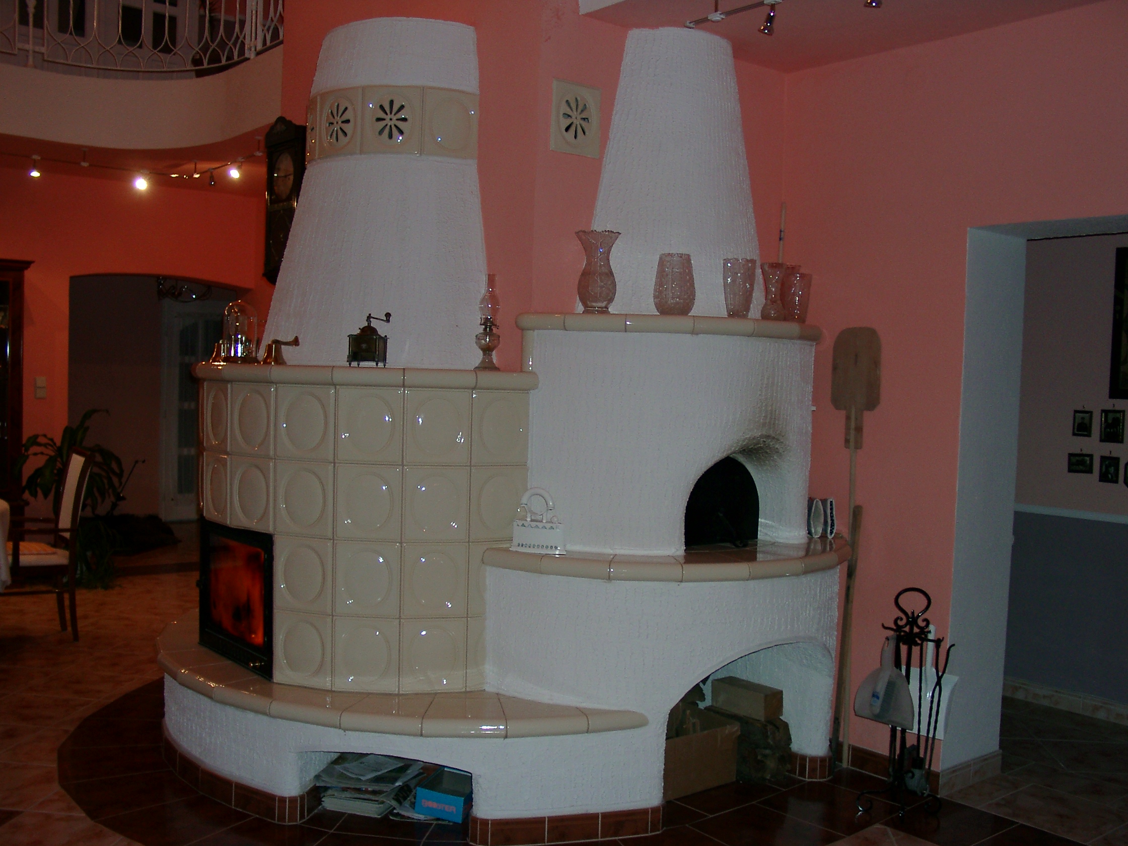 Csempekandalló kemencével egybeépítve, külön-külön kéménybe kötve. Tehát lehet fűteni, lehet sütni. Ez különleges megoldás.