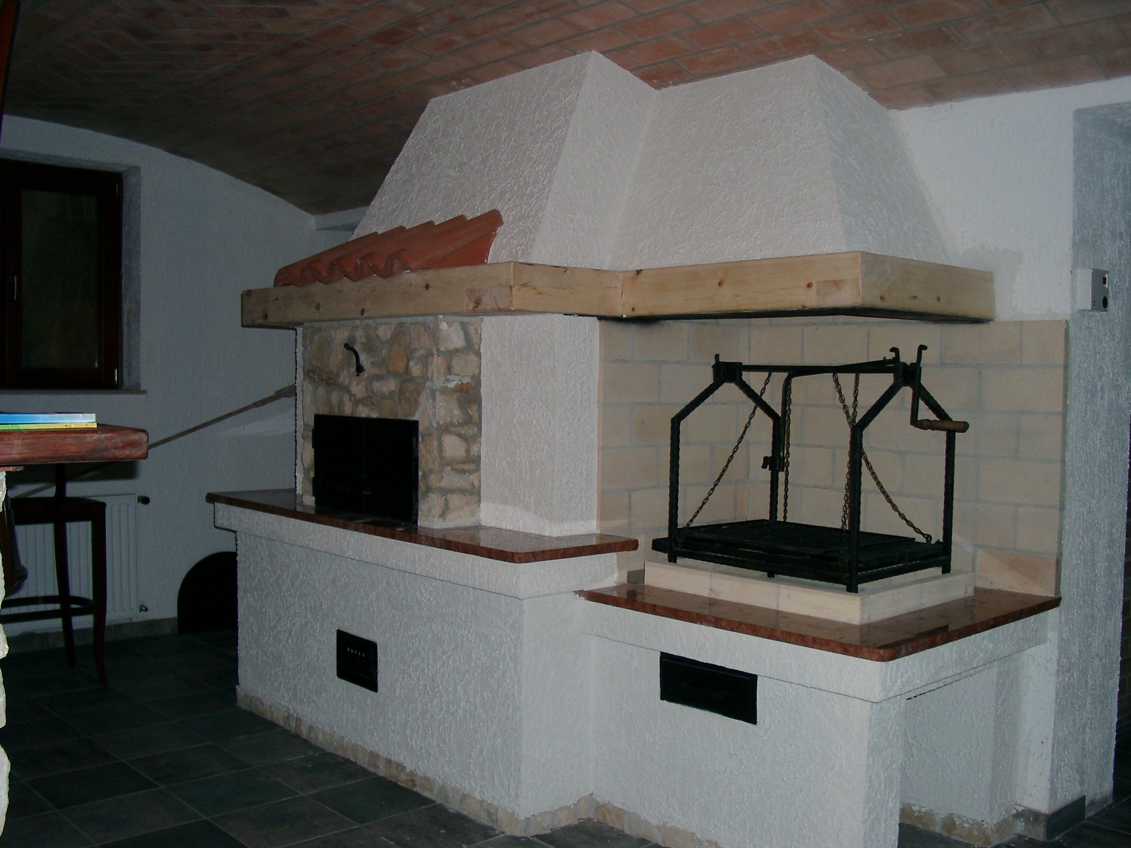 Konyhában épített kemence tekerős grillel egybeépítve.