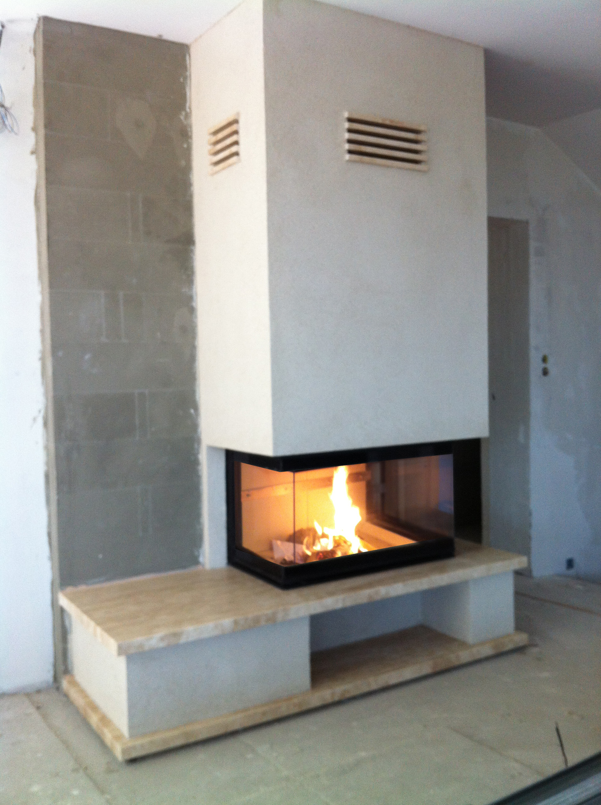Edilkamin SIDE3 tűztérrel épített liftes kandalló, mészkő párkánnyal. Ventilátor beépítéssel három szoba fűtésére alkalmas. (Építés közben)