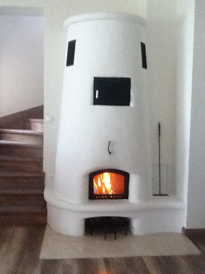 Tűzálló betonból öntöttünk 75 cm átmérőjű és 45 cm belmagasságú kemencetestet. Erre elhelyeztünk egy hőleadó betétet. Így sütésre és fűtésre is alkalmas. A kemencetest le van szigetelve és téglából alakítottuk ki az elképzelt formát.