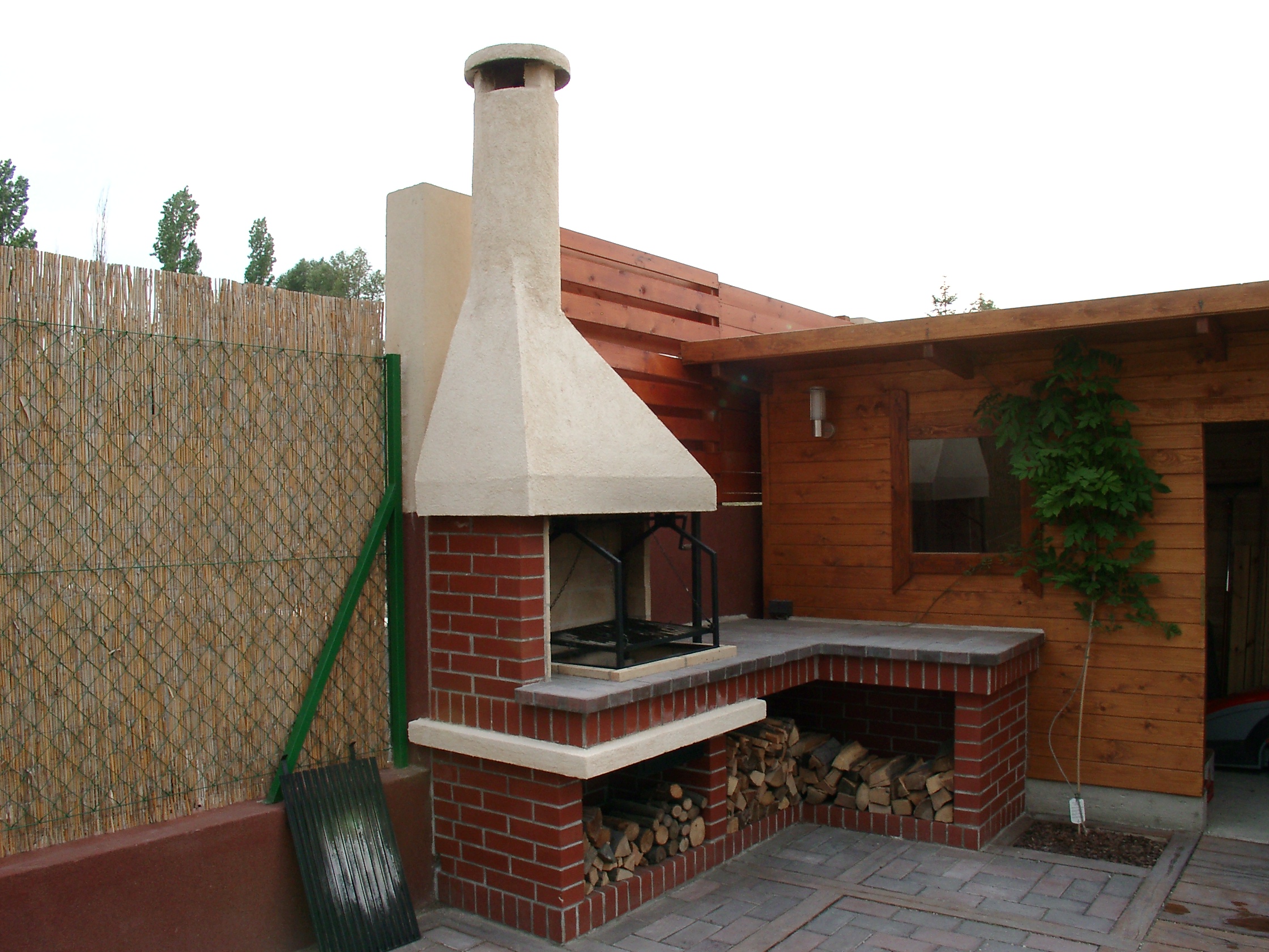 Önálló kéménnyel együtt épített létesítmény, tekerős grill részére. Munkaasztal és a tároló hely is kialakításra került.